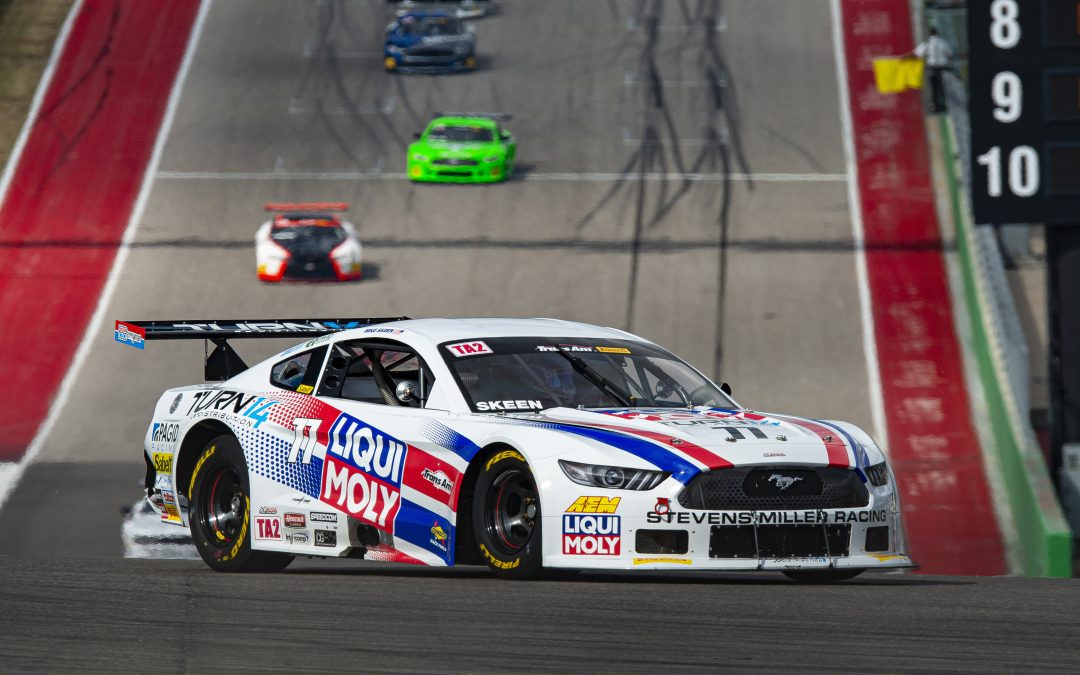 Championship-leader Skeen finished third in the pole-winning No. 77 LiquiMoly/Turn 14 Ford Mustang. Not content to “points race,” Skeen failed to lead a lap but made several aggressive moves to improve his position, finishing the race with damaged rear bodywork.
